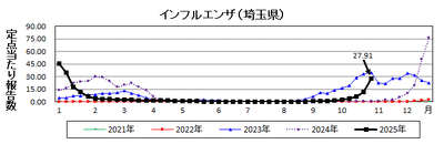 埼玉県では、10月27日~11月2日の1週間で、インフルエンザの定点当たり報告数が、基準値を大きく上回り、27.91(※注意報レベル基準値:10.00)となりました。