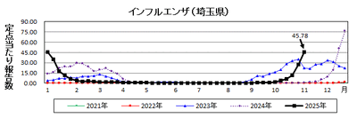 埼玉県では、11月3日~11月9日の1週間で、定点当たり報告数が警報レベルを大きく上回り、45.78(※警報レベル基準値:30.00)となりました。