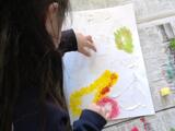 2校時、2年生が切り抜き版画に挑戦していました。スポンジで絵具をポンポンと付け、台紙から型紙を剥がすと、くっきりと模様が浮かび上がりました。子供たちは「わぁきれい!」と版画の面白さを体験していました。
