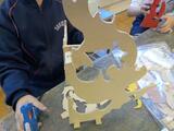 5・6校時、5年生の子供たちが、曲がりくねった木切れを組み立てて作品をつくっていました。形を工夫しながら、思い描いたデザインに近づけるためにどの子も集中していました。最後は色塗りで仕上げ、個性あふれる作品に仕上がっていました。